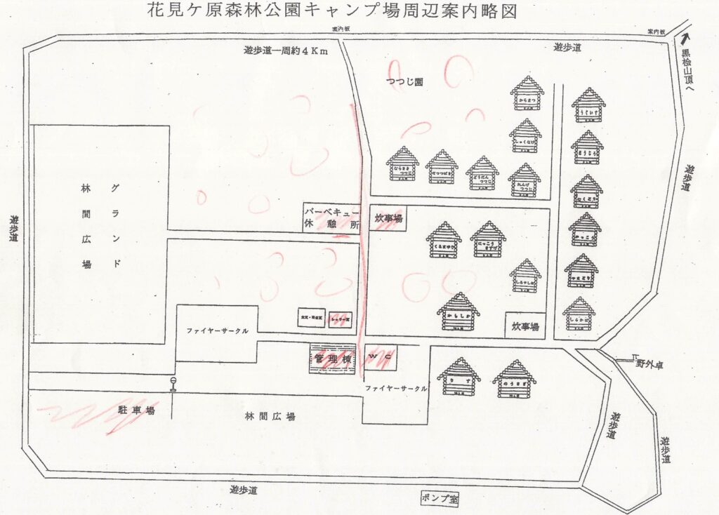 受付のとき説明でもらった略図です。赤い丸をつけたエリアで、良さそうな場所を探してテントを張るように言われました。車は、公園入り口付近の駐車場に駐めることになりますが、荷物の積み下ろしは車を近くまで乗り入れられます。