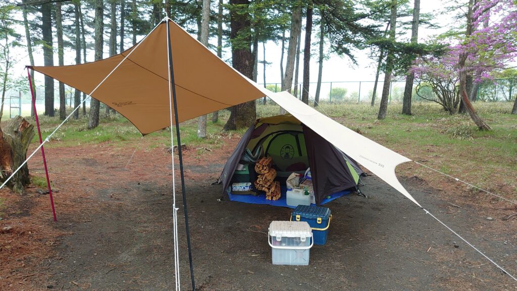 雨は降りましたが、気温はそこまで下がらず7℃台でした。二日目は天気が回復してのですが、テントとタープを完全に乾燥させる時間も無く、家に帰ってから干すことになりました。