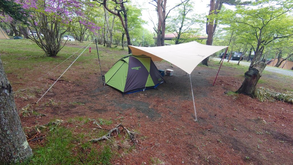 雨の予報もあるので、サイトの一番高そうなところにテントを配置して、ヘキサタープと連結する計画で設営をスタートします。