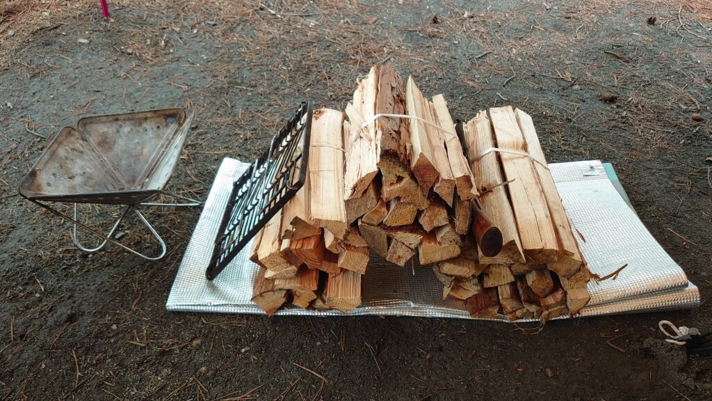 飲みながらたき火を始めます。今回の薪は、こちらのキャンプ場で調達しましたが、一束の値段200円と激安です。しかし、三束は多いですね^^;