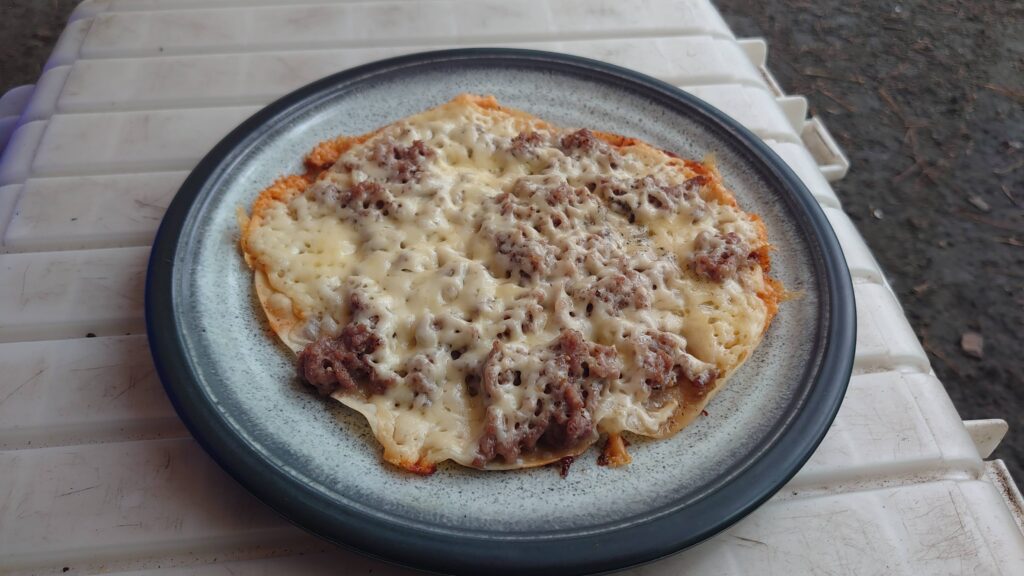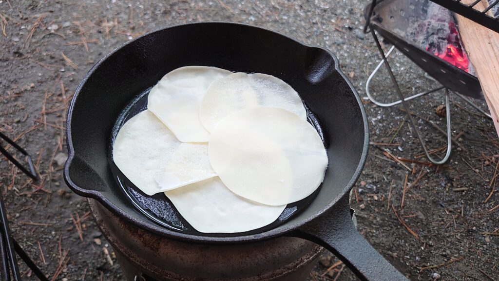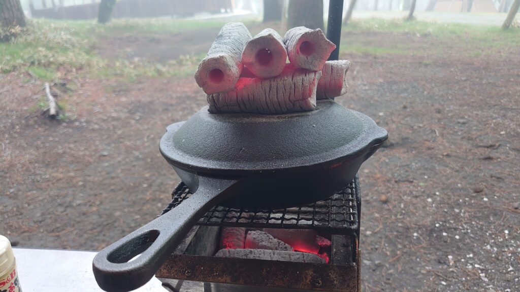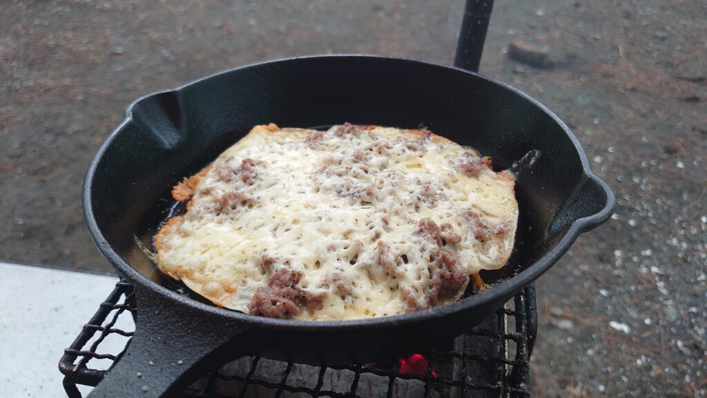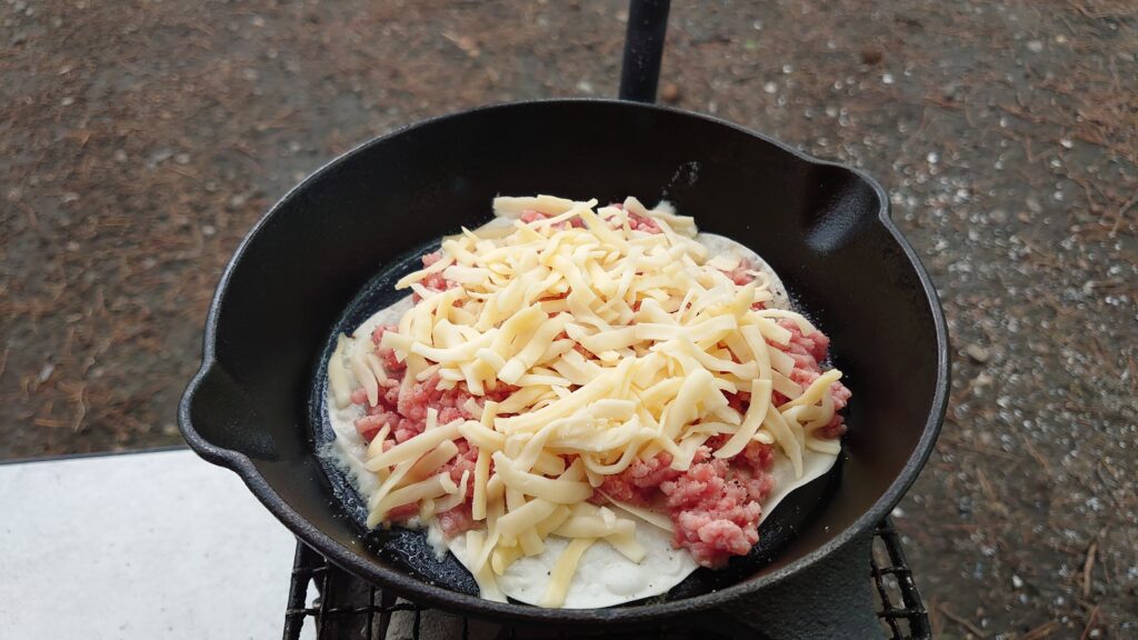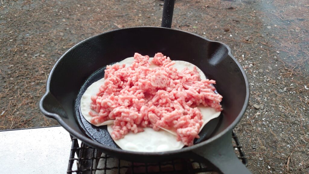 火が起きたところで、炭に火を移し持ってきた肉を焼きます。ここまではいつもと同じですが、今回家の冷蔵庫に賞味期限切れの挽肉とチーズが大量にあり、なんとか食べてしまおうと持ってきていたので、スキレットで調理してみました。