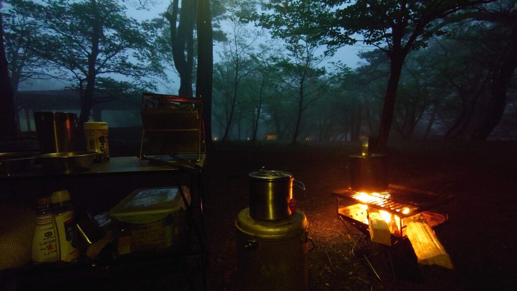 この日は雨の予報もあり、天気は下り坂。暗くなる頃には雨も降り始め、風も強くなってきたので、たき火は終了です。