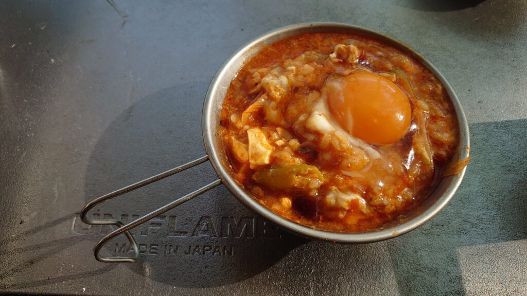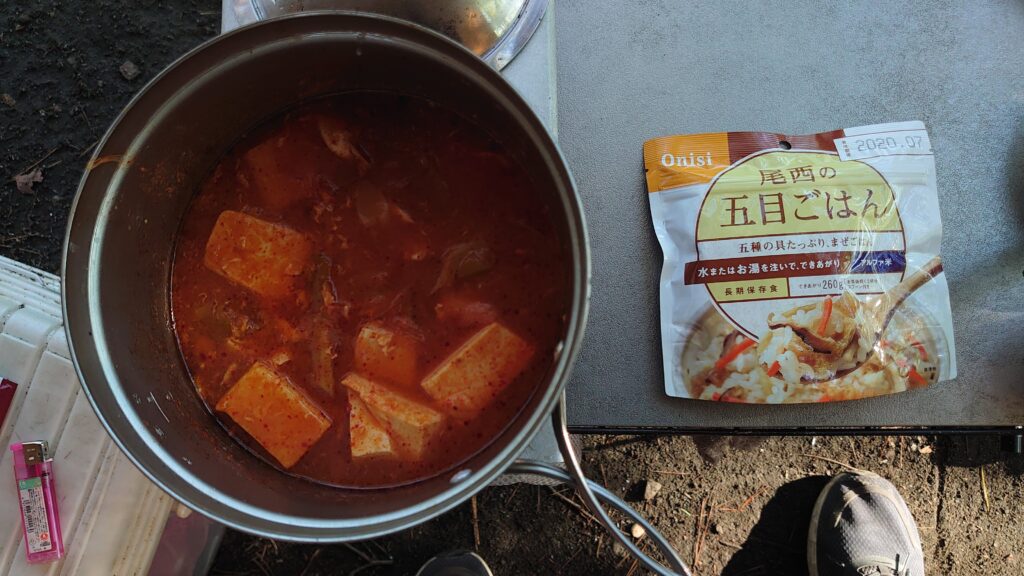 ドローンの空撮がすんだので朝ご飯にします。今回は手抜きで、賞味期限をちょっと切れたご飯と、スンドゥブの残りです。