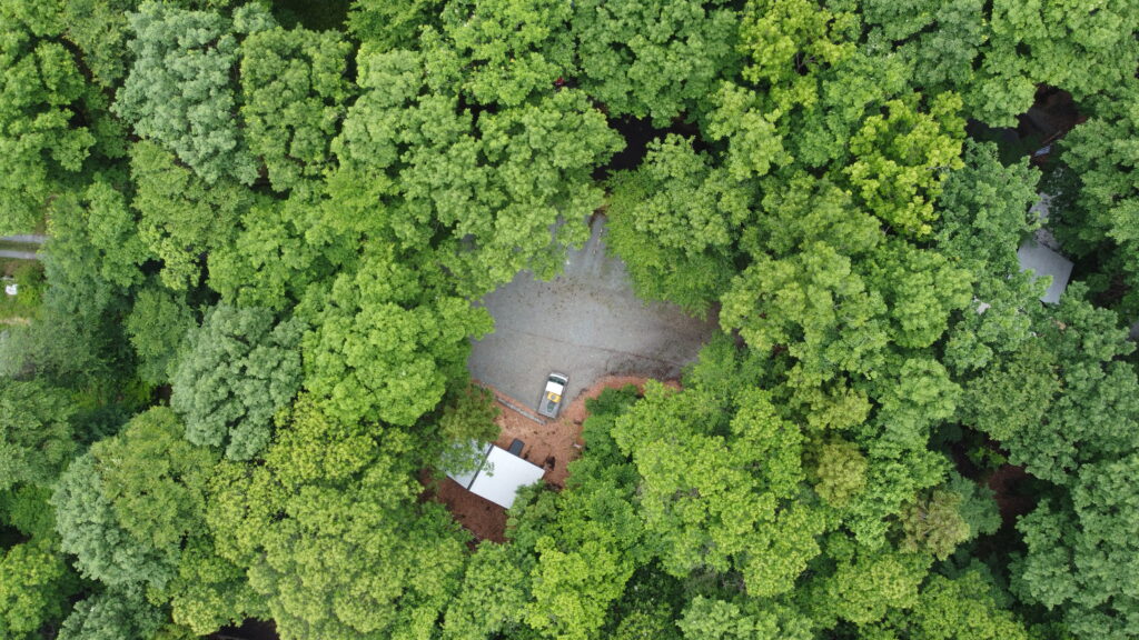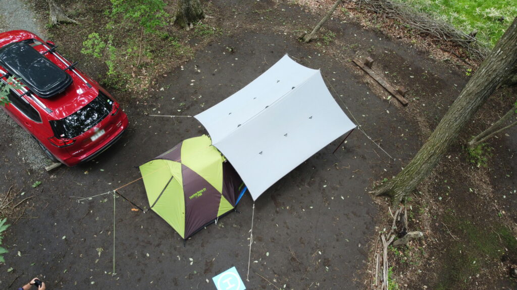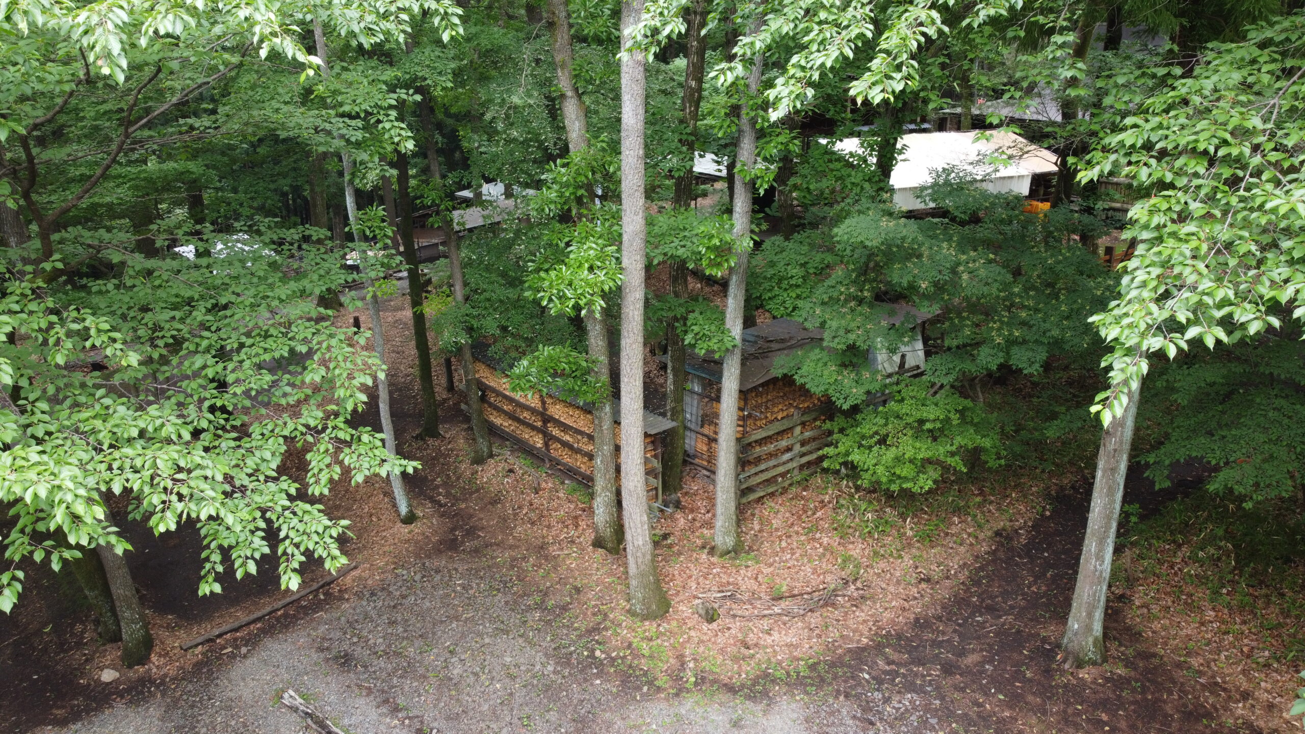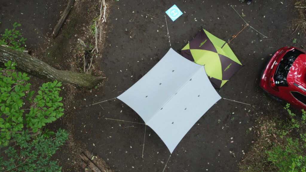 ただ、テントの周りは高い木に覆われていて、この場所でこれ以上高度をとることはできません。木にぶつかって墜落しないか恐る恐るの撮影となりました。