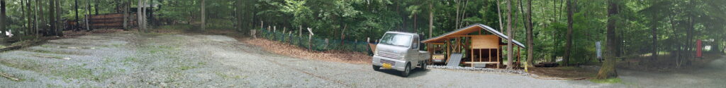 googlフォトのAIによる駐車場のパノラマ写真です。ここに車を止めて受付を済ませることにしました。ところで受付はどこなのでしょう。軽トラの奥は薪割り小屋のようです。