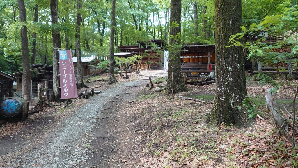 駐車場から、それっぽい方へ歩いてみます。左手のぼりがあるたたりに見えるのは山羊の飼育小屋です。