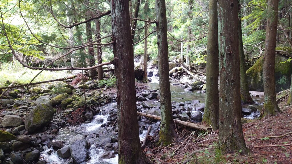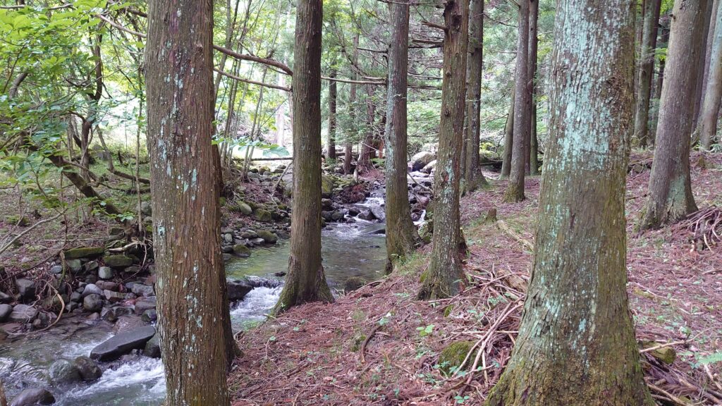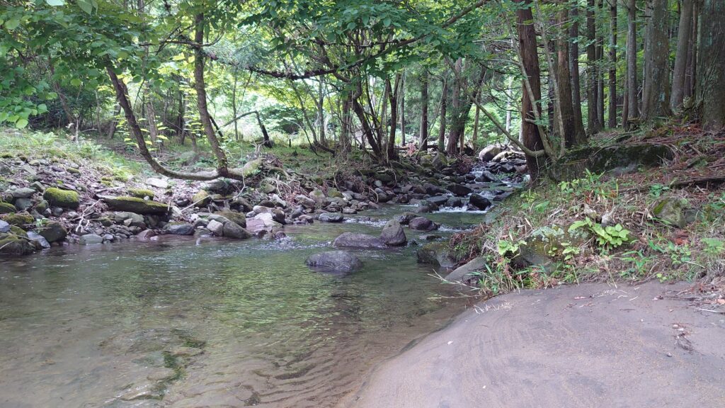 設営が終わったので、キャンプ所の周りを散策してみることにしました。降りると沢があると言うことなので見てくることにします。管理人さんが、降りるときは声を掛けて欲しいと言うことだったので、川を見てきたいと話すと、行き方を教えてくれました^^;