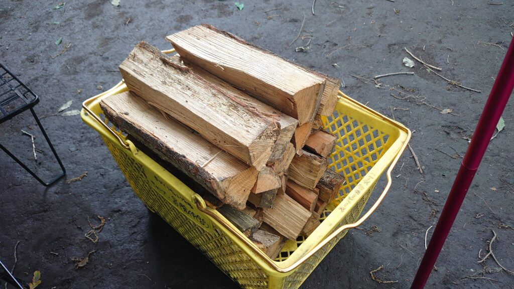 買い物かご一杯に入れて1000円です。こちらのキャンプ場にはポイントカードがあって、ポイントで初めてもらえるのが薪五本と言うことでした。それで、かごに入れた薪の上に五本追加で乗っています。