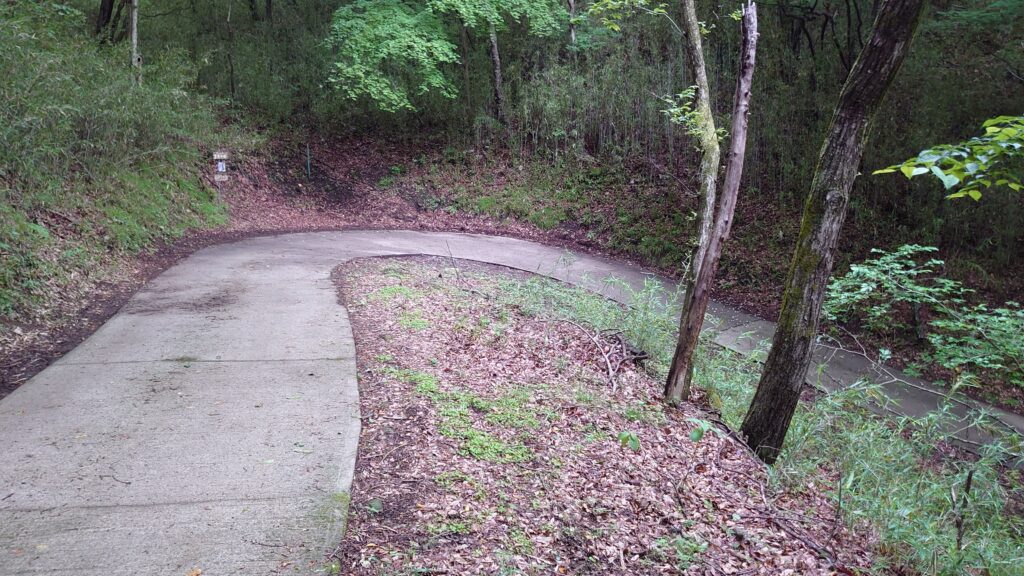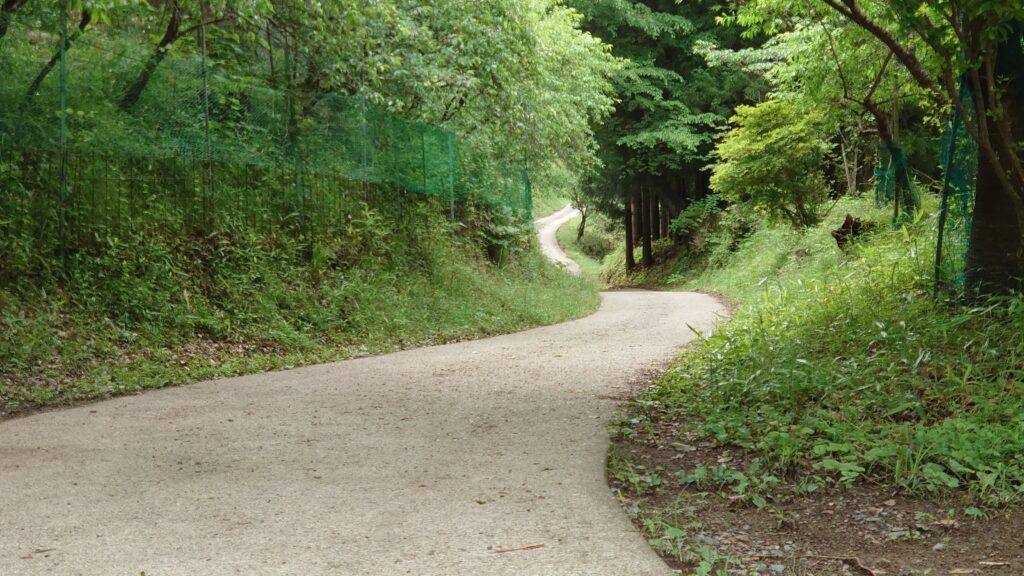 砂利道から、コンクリートで舗装された道へと変わります。しかし道幅が狭く、すれ違いには苦労しそうです。キャンプ場までの1km程度の間、すれ違いができるであろう場所は数カ所しかありませんでした。