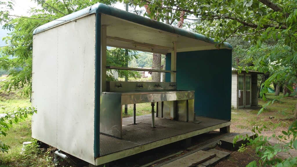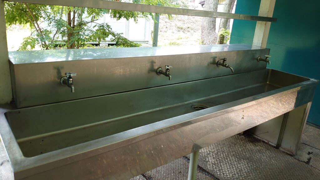 この裏側にも同数のカランがあります。調理をするスペースはないのですが、上に棚があります。設備らしいのこのくらいですが、必要十分で問題ありません。受付棟では薪を販売していましたが、そのほか何か物品の販売があったのかは確かめていないのでわかりません^^: