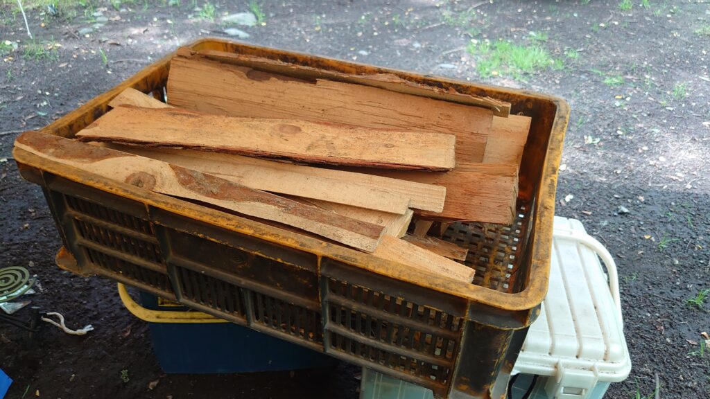 こちらのキャンプ場で購入した薪です。現在はこれで500円ですが、広葉樹と、たき付け用の針葉樹が少量入っていて、たき火はかなり楽しめそうです。実際、大変良質の薪でした^^