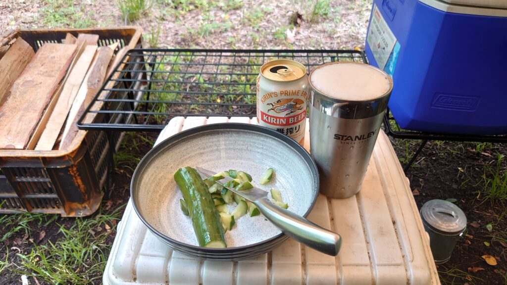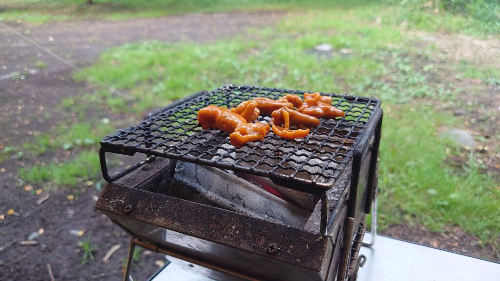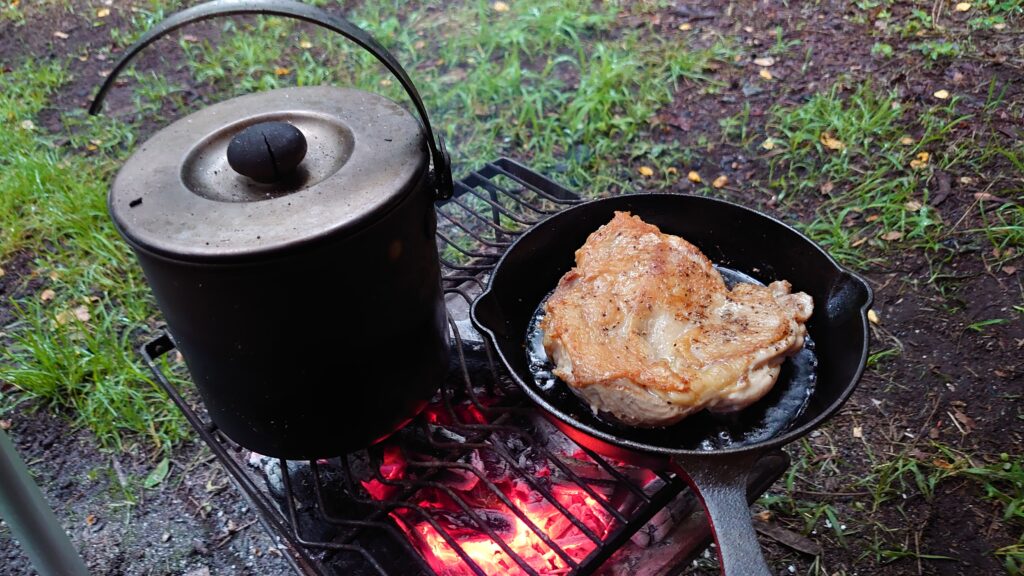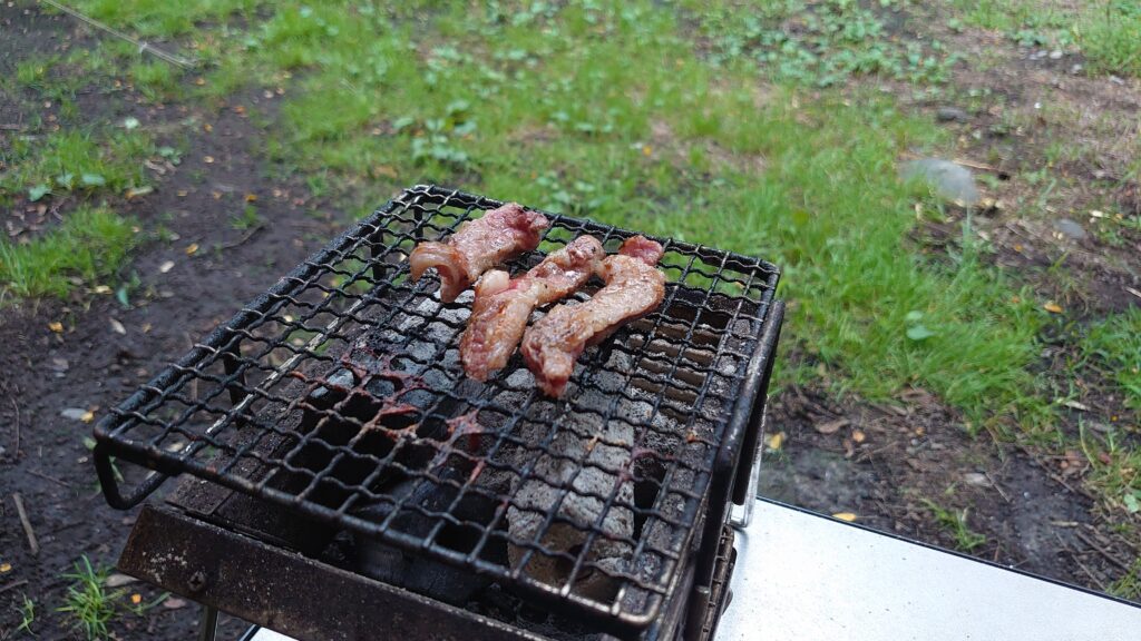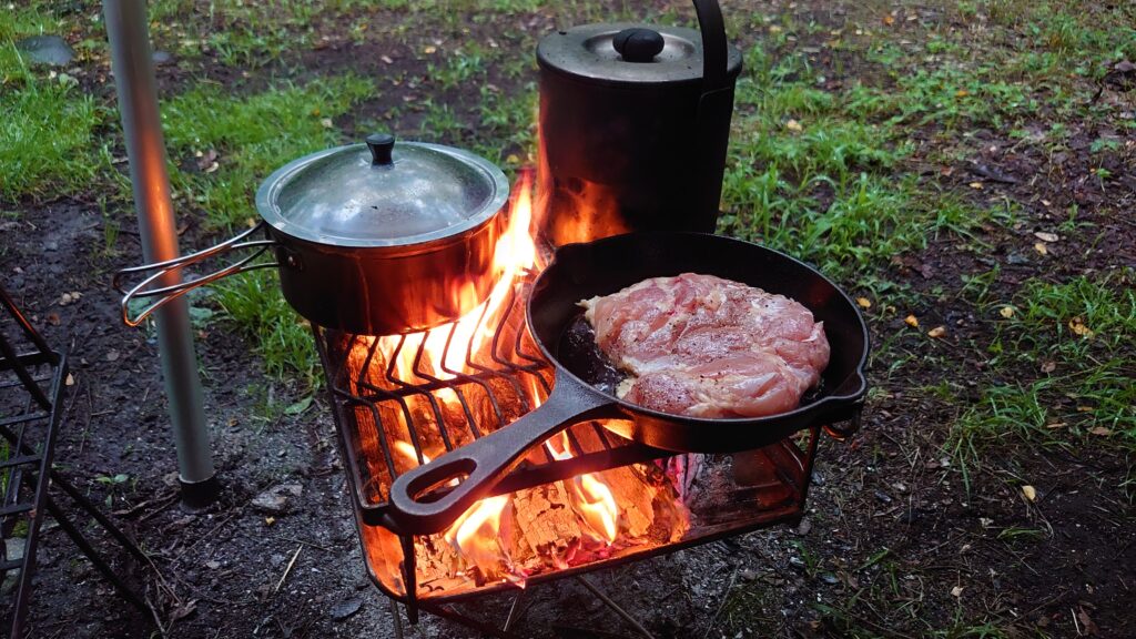 直火も可能のようですが、突然の雨も心配なので、焚き火台を使っての焚き火にしました。川沿いですが、標高がそれほど高いわけでも無く、晴れたせいで気温も高めでした。