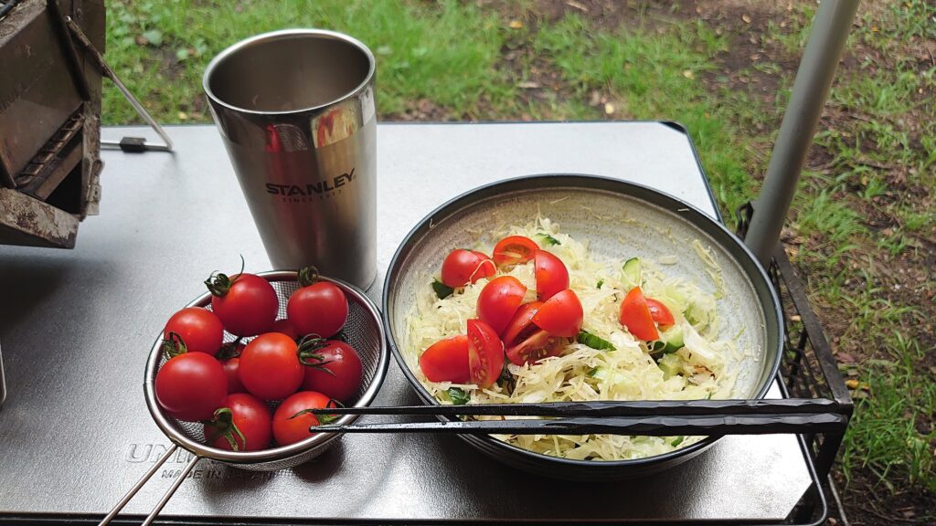 来る途中の農産物直売所で購入したトマトもぶち込んでごちゃごちゃに^^;