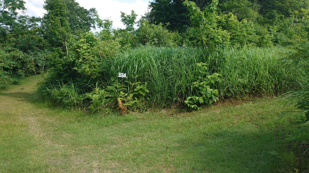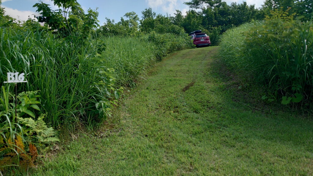 津南キャンプ場は何度か利用し事がありますが、4WD推奨のサイトは初めてです。ですが、そこまで荒れた道や傾斜は無いだろうと思いながら、予約したB-16サイトを目指します。正面に見えているのがB-15サイトで、B-16サイトは、左に曲がってしばらく行って右に入ったところですが・・・
