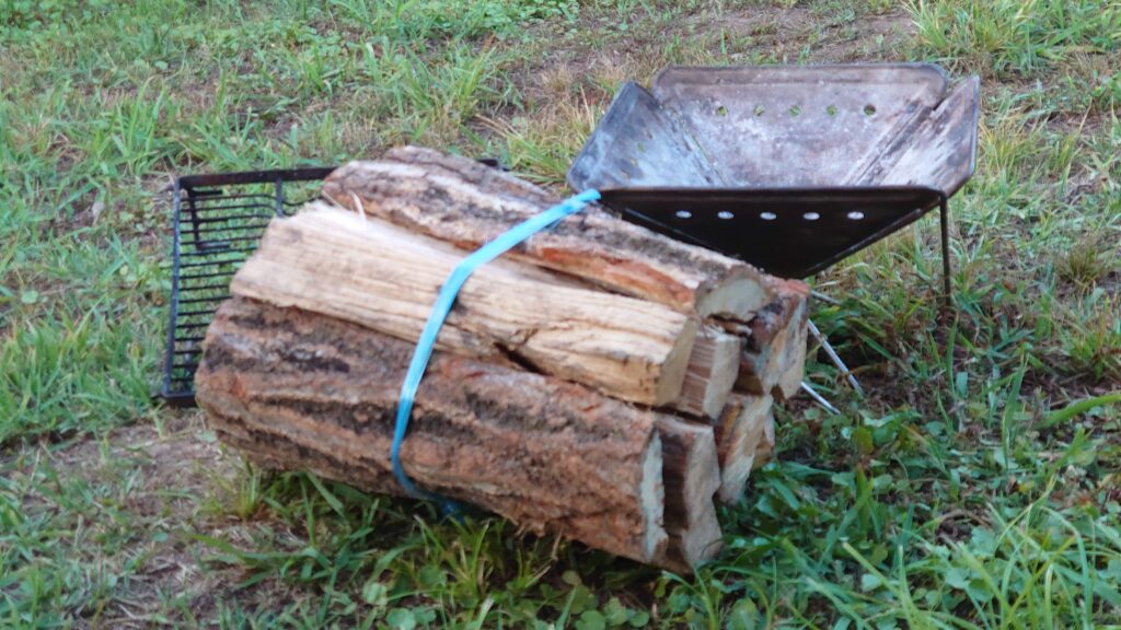 焚き火をして、炭をおこすことにしました。今回使うのは、こちらのキャンプ場で購入した広葉樹の薪で、一束770円です。