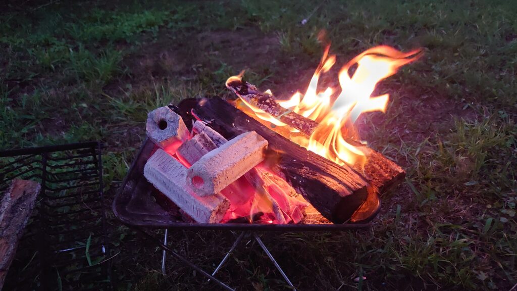 持ち込みのたき付け用の薪で着火して、いつものようにオガ備長炭をぶち込みます。少々時間はかかりますが、急ぐ必要は何も無いのでのんびり飲みながら待つことにします。
