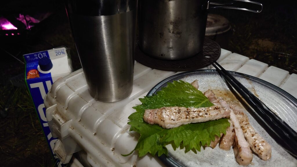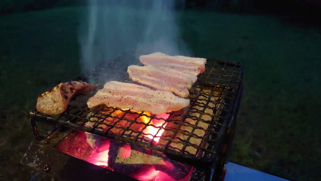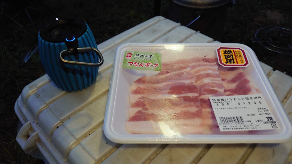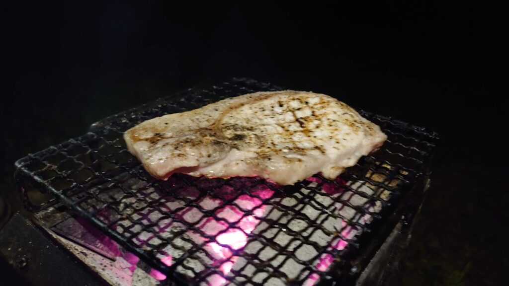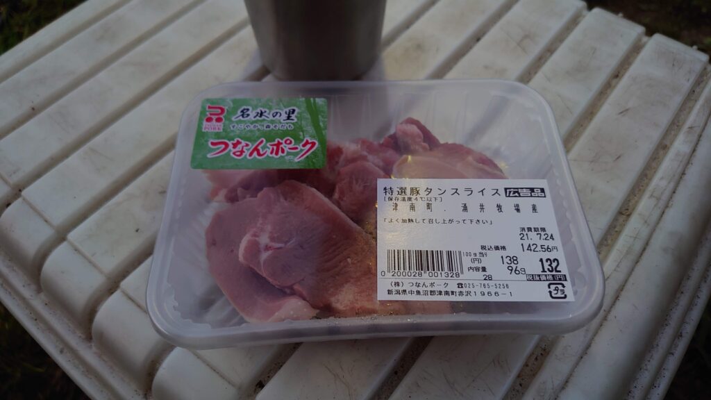 火が起きたら、これまた来る途中で仕入れた津南ポーク