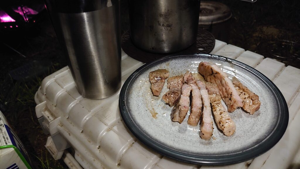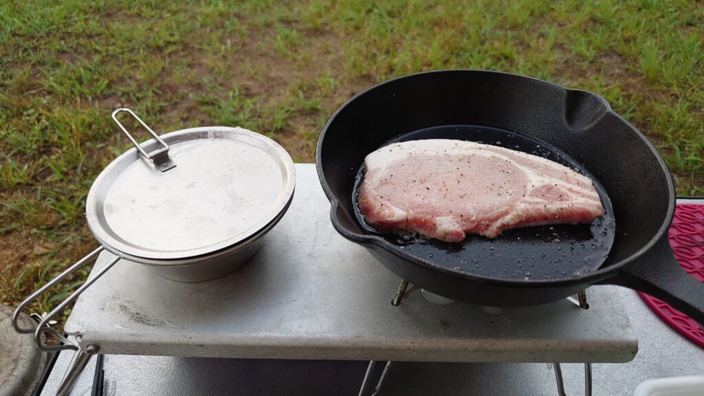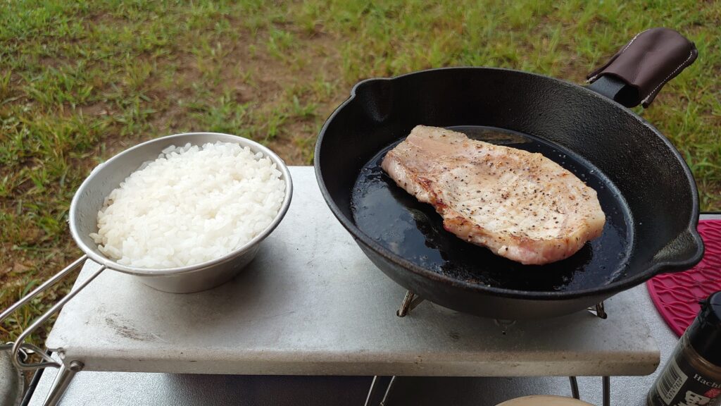 蒸らしている間に、スキレットで津南ポークを焼いていきます。