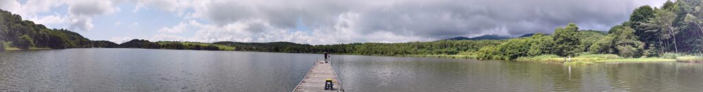 七月のバラギ湖は水温が高く、魚の活性が落ちるので放流も控えているようです。つまりなかなか釣れないと言うことになりますが、料金の方は半額になっているので、のんびり時間を潰すにはいいかもしれません。バラギ湖の釣りのエリアは、ルアーとフライで多少違いがありますが、三つある桟橋は共通のつりエリアになっています。なかでも、湖に小さい川が流れ込む一番奥の桟橋に人が集まることが多いようです。今回も、一番奥の桟橋で釣り始めましたが、一投目のリトリーブ中にあたりがあっただけで、その後はピクリともしませんでした。