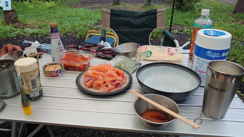 魚は、設営後キャンプ場の炊事場でさばいて刺身にしましたが、自分で釣っていないのでいまいち気分は乗りません。2匹いたマスは雄と雌だったようで、腹の中には卵や白子がありました。とにかく、全部スライスして、適当に盛り付けて、さっさと飲み始めることにしました。
