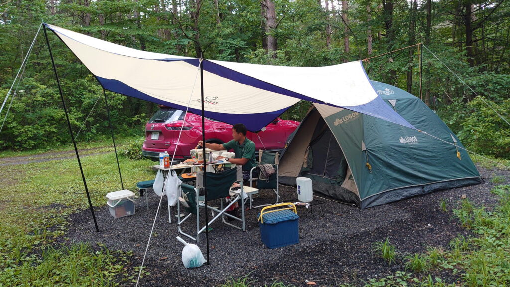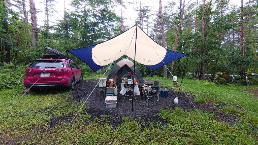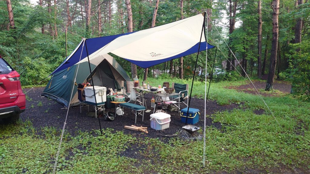 この三人で出掛けるときは、いつもこのパターンでテントとタープを設営しています。ヘキサタープはテントにかぶせているので、雨が降ったところで問題はありません。