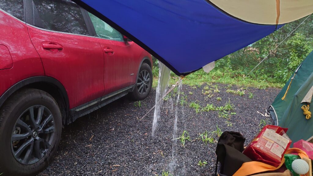 地面を見ると、雨で濡れた部分と、タープの下の乾いた部分がくっきりと区別できます。まあ、ここまでは、雨と言ってもお湿り程度でしたが・・・