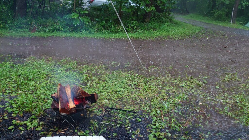 焚き火をしているところに、かなりの勢いで降ってきました。