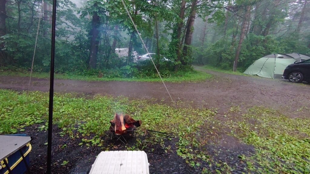 一度勢いよく燃えた焚き火は簡単には消えません。結局雨が止むまで消えずに燃えつづけていました。山火事がなかなか消えないのにも頷けます。