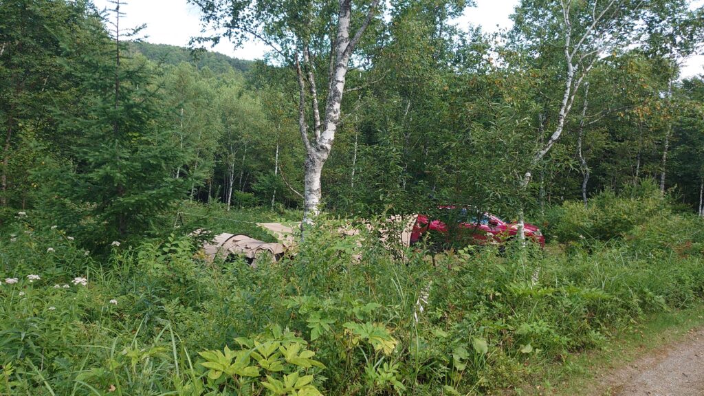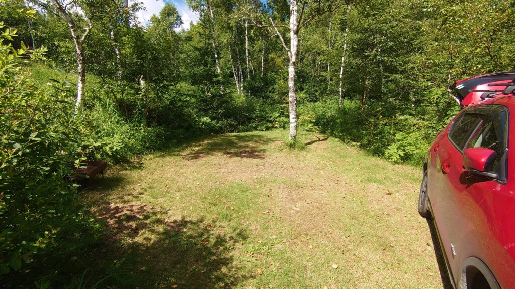 標高1600mの高原に広がるキャンプ場です。気合いを入れてやってきましたが、予約を入れたのは例によって数日前にネットで空きを見つけたからです。C-35サイト、四駆推奨の林間サイトで、キャンプ場の一番奥の方になります。四駆推奨というか、四駆じゃなきゃ無理だと思われる段差があるサイトでした。