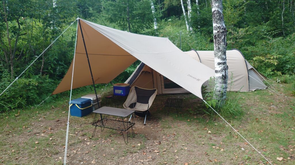 サイトの奥が少し高く、サイトの中央あたりは芝が大分えぐれています。テントを奥に張り、タープをメインの出入り口にかかるようにしてリビングエリアを作ることにしました。