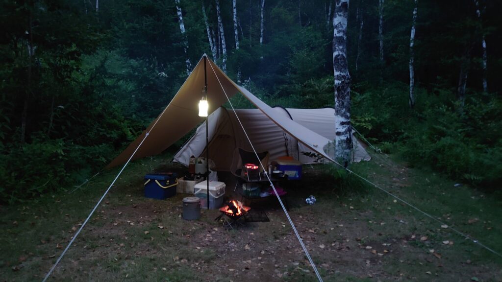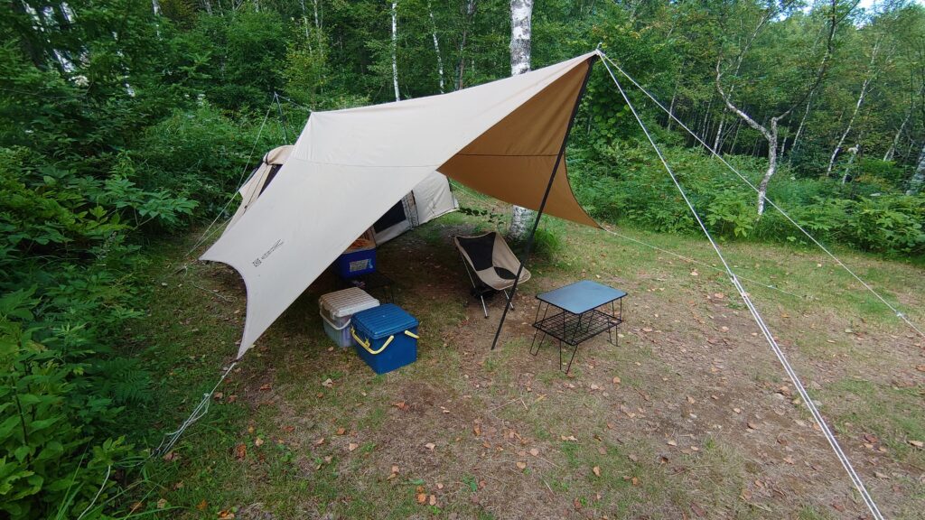 今回は、連泊を考えソロカマTCとヘーキサタープを持ってきました。細長いサイトに真ん中の木、微妙な起伏による雨天時の水の流れなど、いろいろな要素を考慮してレイアウトを考えるのは楽しい時間です。