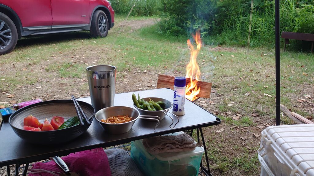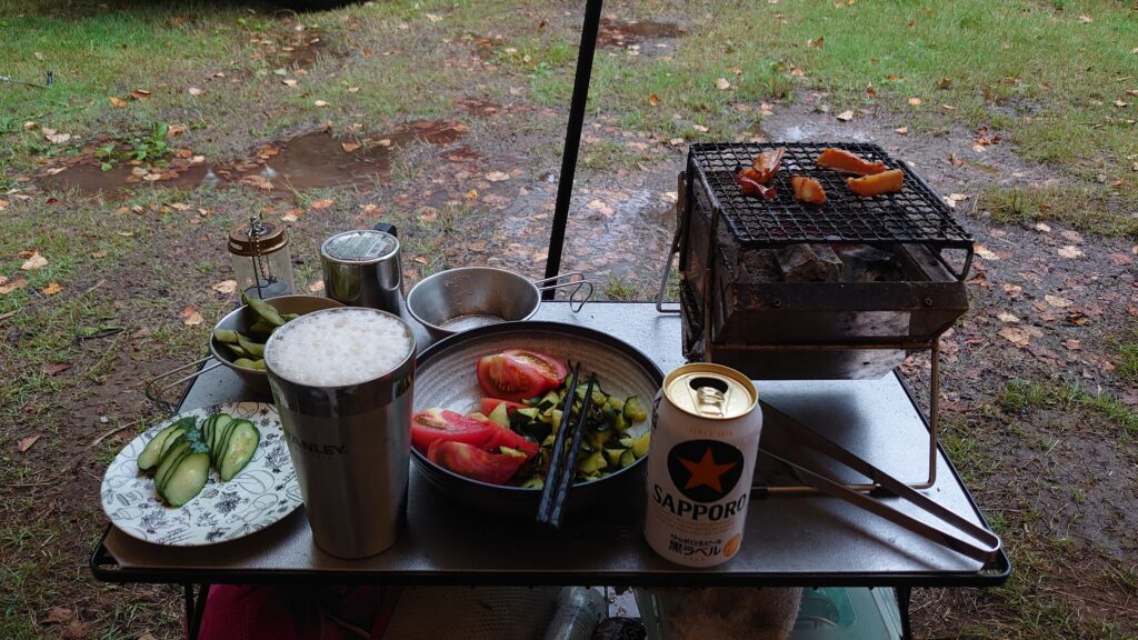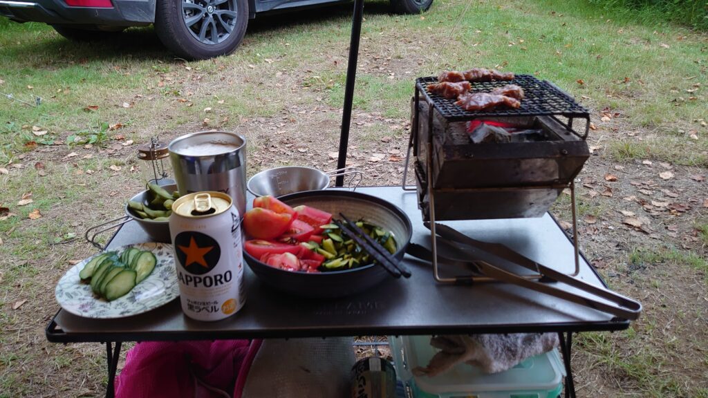 やはり群馬からは遠かった。いつもより始めるのが遅くなったので、さっさと飲み始めて、さっさと火をつけて、炭をおこします。