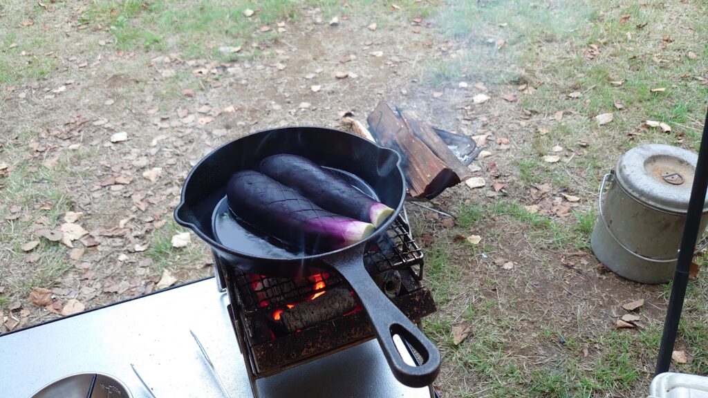 来る途中で仕入れたなすをスキレットで焼きます。