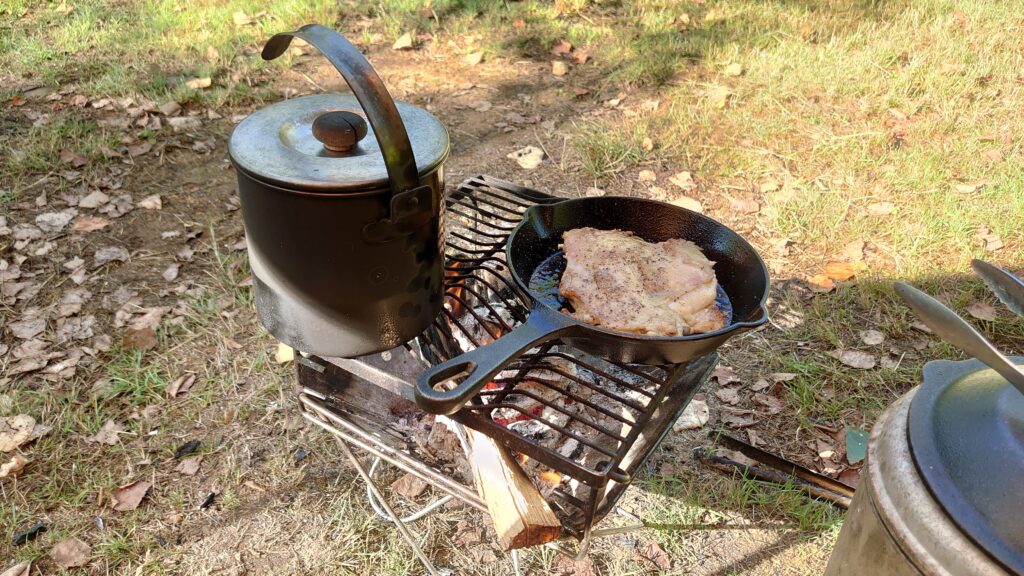 ご飯を炊きながら熾きを使ってスキレットで鶏を焼きます。