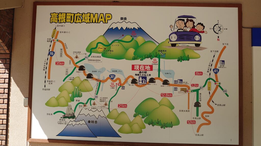 道の駅の案内用の広域マップです。近くに買い出しができるお店は、道の駅くらいしか無いようですが、ビールだけは買い出しせねばなりません。結局高山市のお店までドライブをすることになりました。