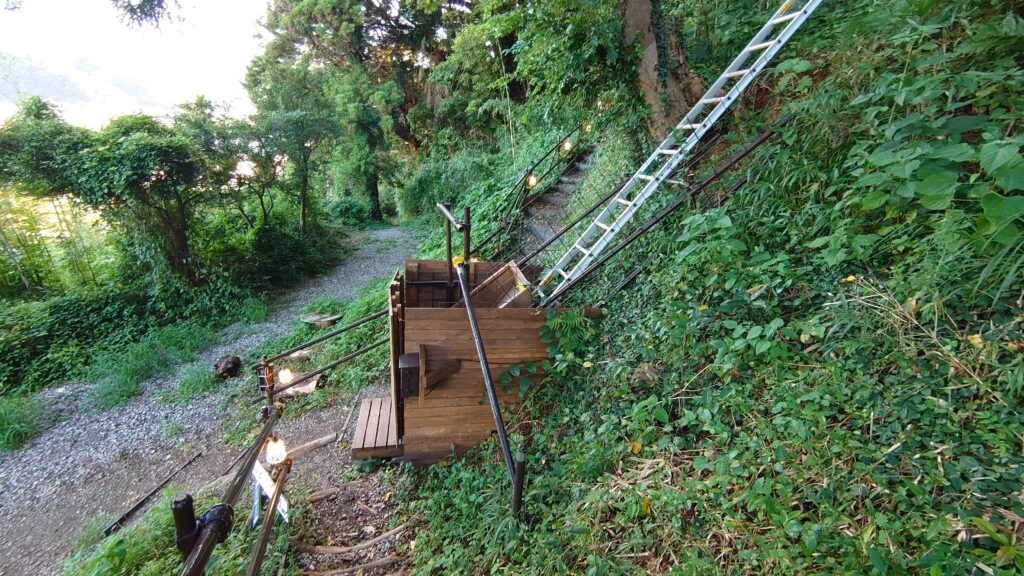 水平距離はたいしたことないんですが、かなり厳し勾配の登りです。荷物運びのカートも役に立ちません。ここを運ぶのはかなりきつそうです。まあ、一人で運ぶわけではないですが^^;