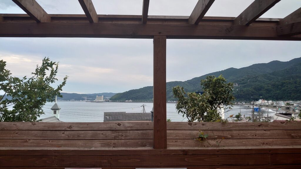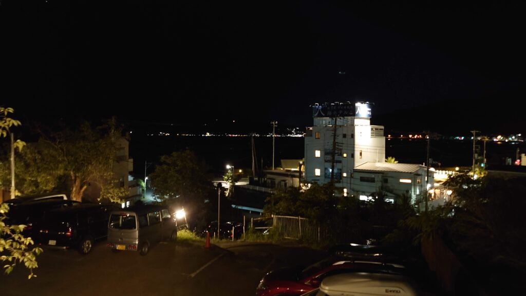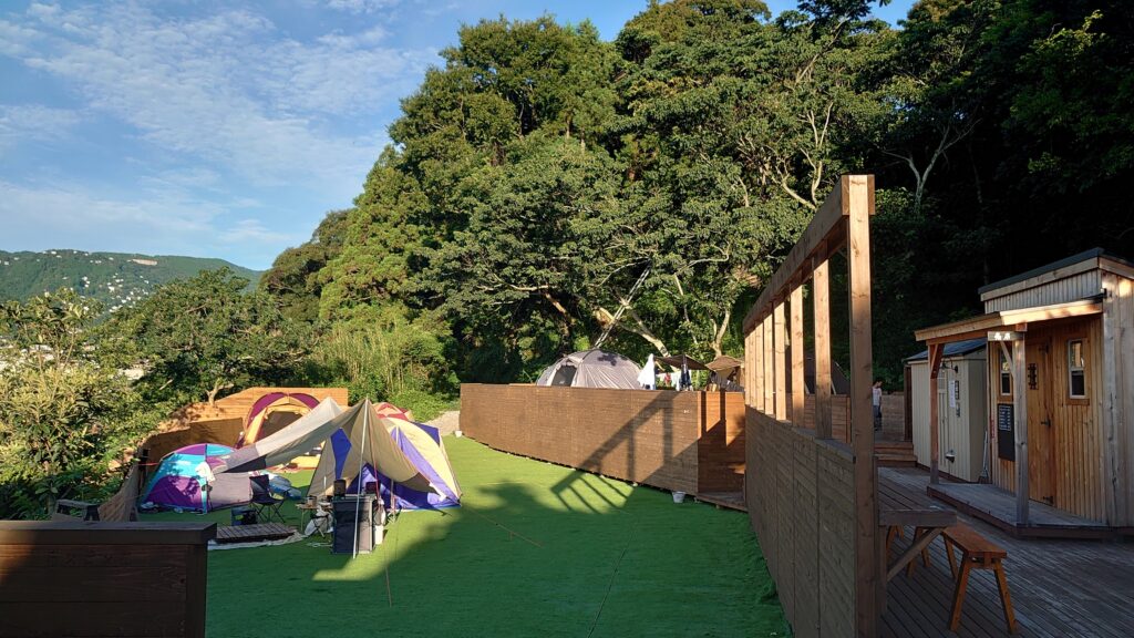 国道がすぐ近くを通っているので、静かなキャンプかと言えばそう答えづらいですが、高台からの眺めはなかなか素敵です。ただ二の丸エリアは、荷物運びがかなり大変なので、荷物少なめか気合い十分なキャンパーさんじゃ無いと厳しいかもしれません。このあと、伊豆地方はかなり激しい雨がしばらく降り続くことになり、雨の中の撤収をしなければならなくなりましたが、掛け流し温泉など、とても魅力的なキャンプ場でした。高台エリアの本丸オートキャンプサイトの様子は、今回確認できませんでしたが、荷物運びや雨天時の撤収劇を考えると、次回利用するときはオートサイトがいいなぁと思うのでありました。
