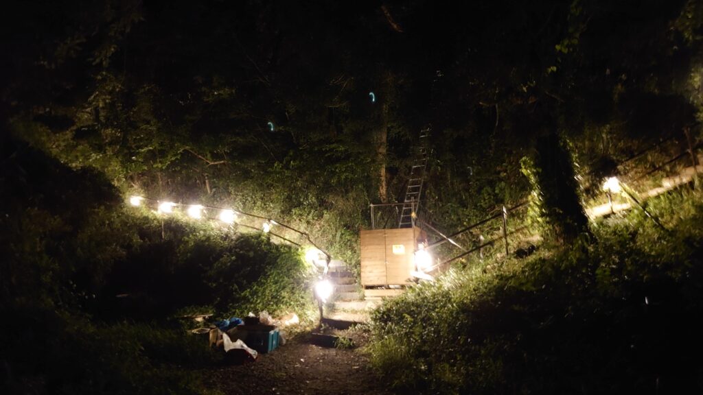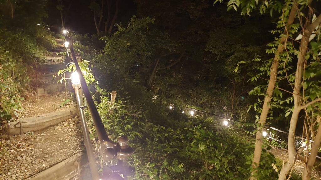 キャンプ場内の階段は、手すりに照明が付いているので、それが点灯するとなんかお祭りみたいです。