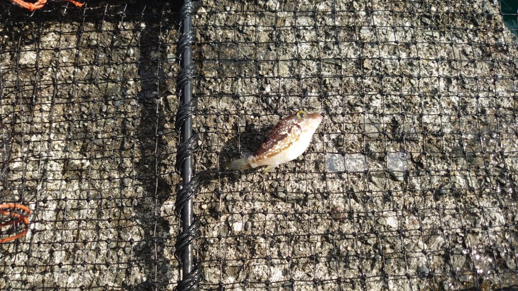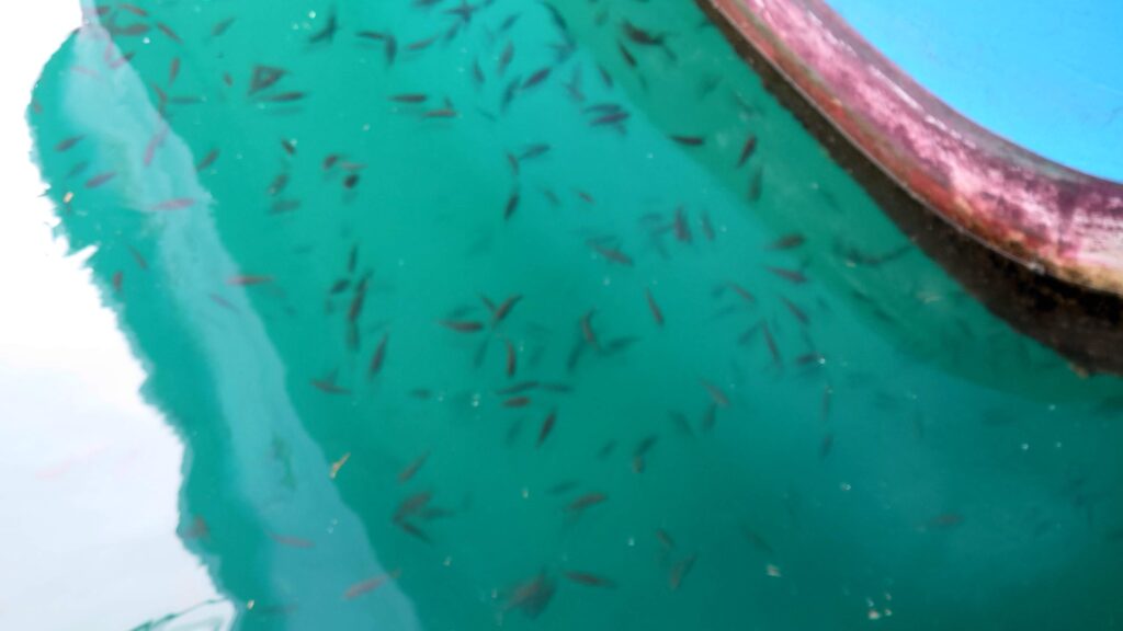 停泊している船の下には、たくさんの小魚がいますが、だからって釣れるわけではありません。数匹釣れましたが、10cmにもみたいな小さな魚ばかりでリリースしました。