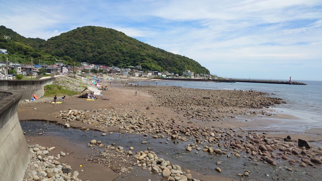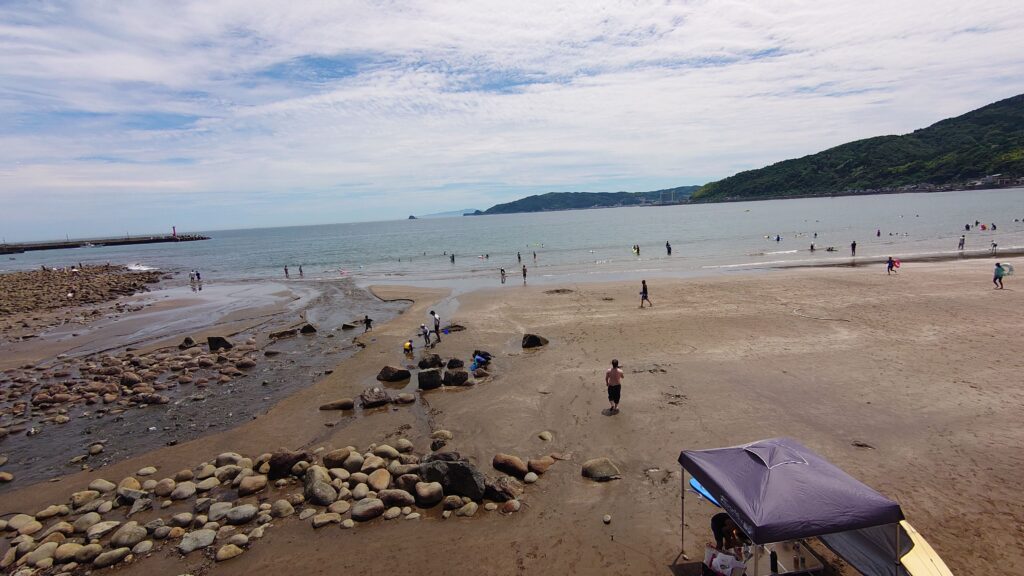 砂浜が続く遠浅の、のんびり水浴びするにはよい海水浴場です。