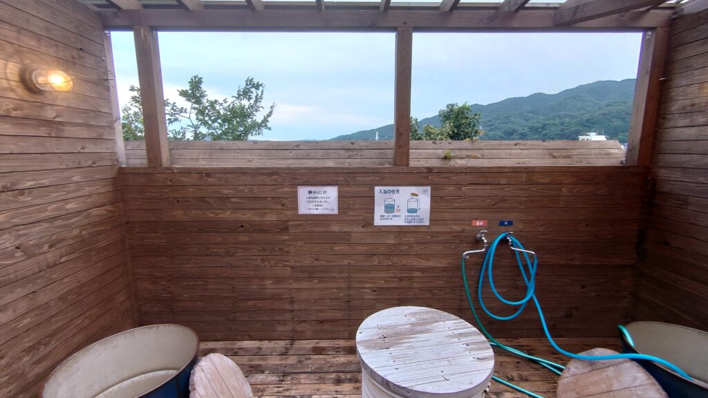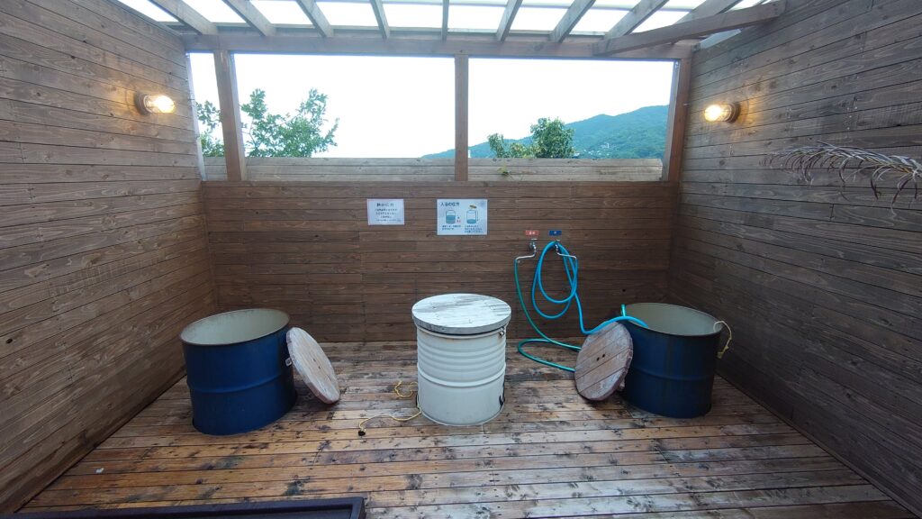 キャンプ場内の無料で利用できるドラム缶風呂です。時間制限ありの予約制ですが、温泉が贅沢に使えます。