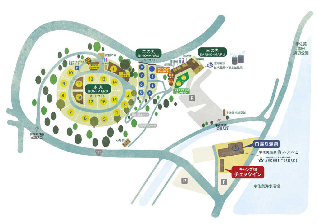 キャンプ場のマップを見ると、本丸、二の丸、三の丸と三つのエリアに分かれています。駐車場から荷物は運ばなければならないのはわかっていましたが、距離もたいしたこと無さそうだし、そんなに大変じゃないだろうと思っていました。