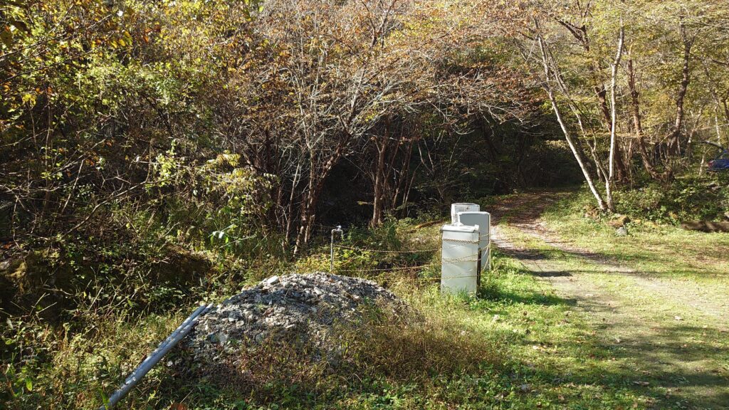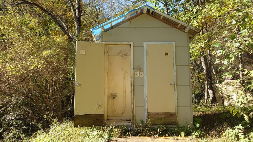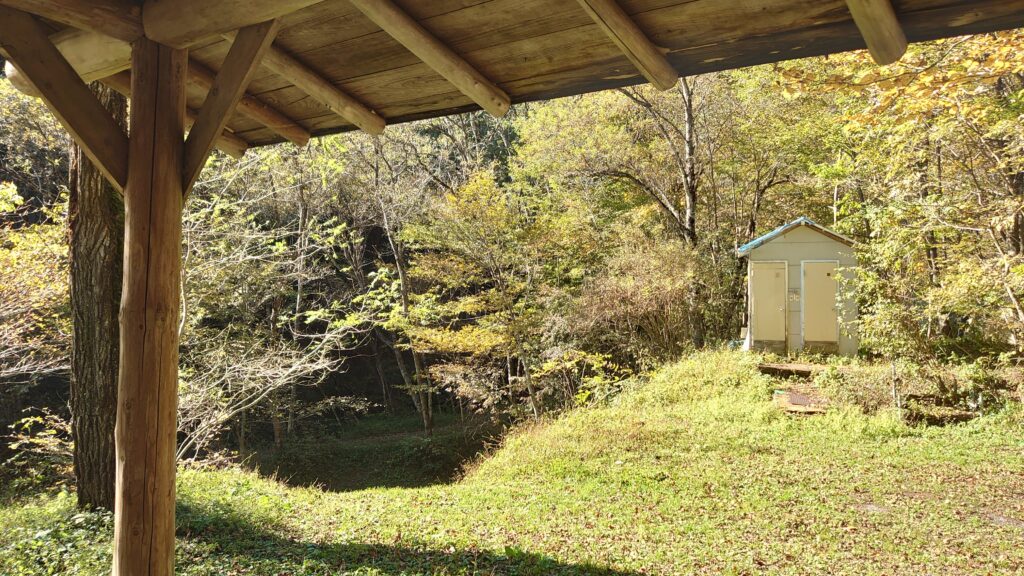 今回設営したエリアはシャワルームと水場の先を降りたところです。