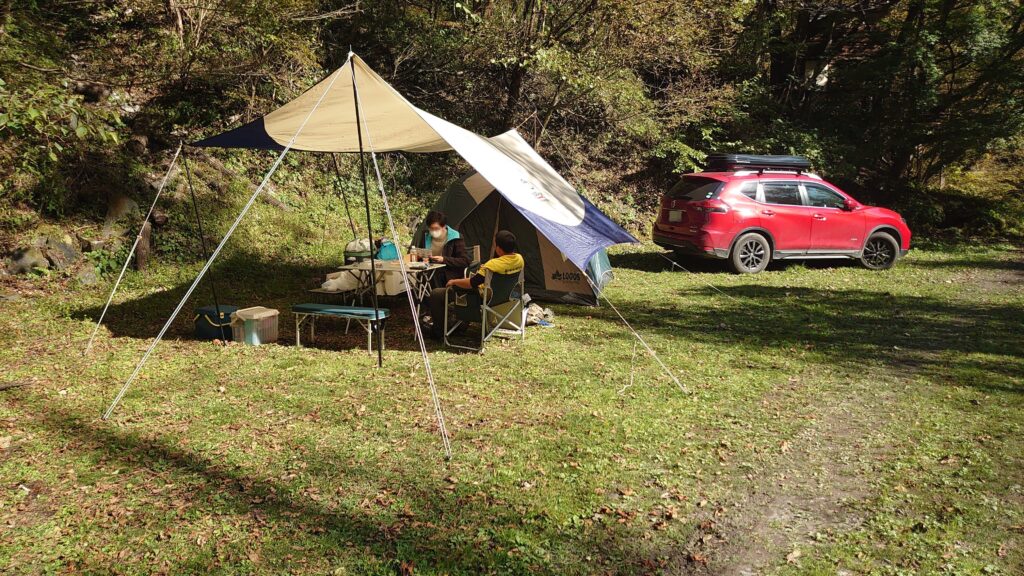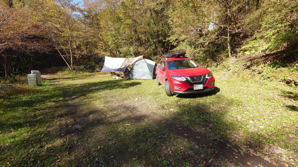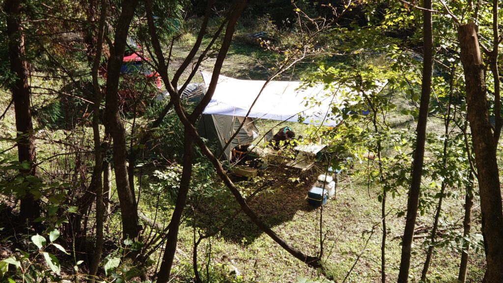 管理棟でキャンプと釣りの受付を済ませ設営場所を探します。トレイや水場があるエリアは既に先客がいるので、そこから一段下がった場所を使わせてもらうことにしました。トイレと水場から離れることになりますが、特に問題は無いでしょう。むしろ、川に近い分釣り場には行きやすくなります。
