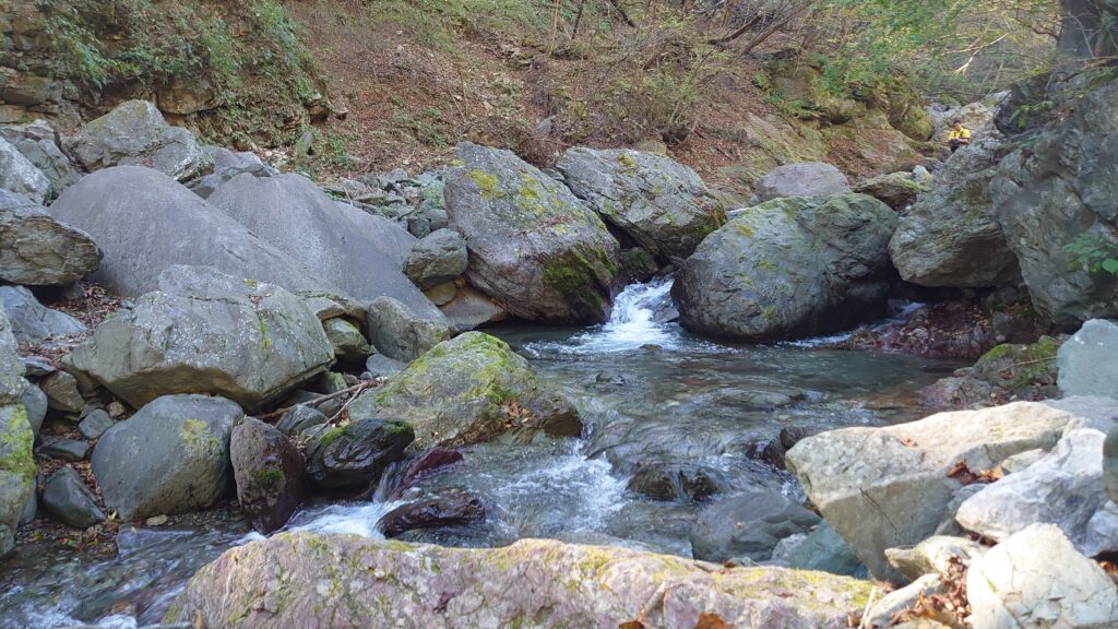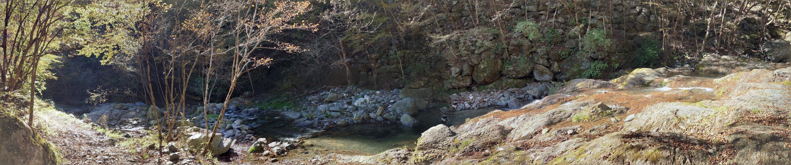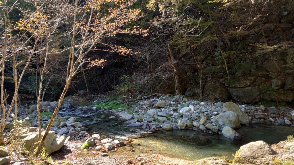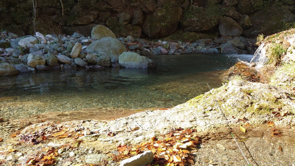 キャンプ場を降りたあたりの沢の様子です。受付の時に、キャンプ場から少し下った滝の下あたりがよいのではないかと勧められましたが、どこだか場所もよくわからないし、あまりたくさん歩きたくも無かったので、それっぽく開けて釣りがしやすそうなところで釣り始めました。
