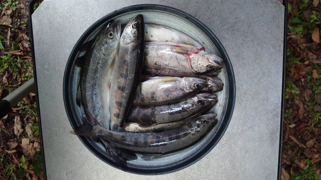 ここで9匹、川を上がりながら1匹の合計10匹釣って、寒くなったので上がることにしました。今回釣れたのは全部ヤマメでした。さっさと焚き火をして塩焼きにすることにします。