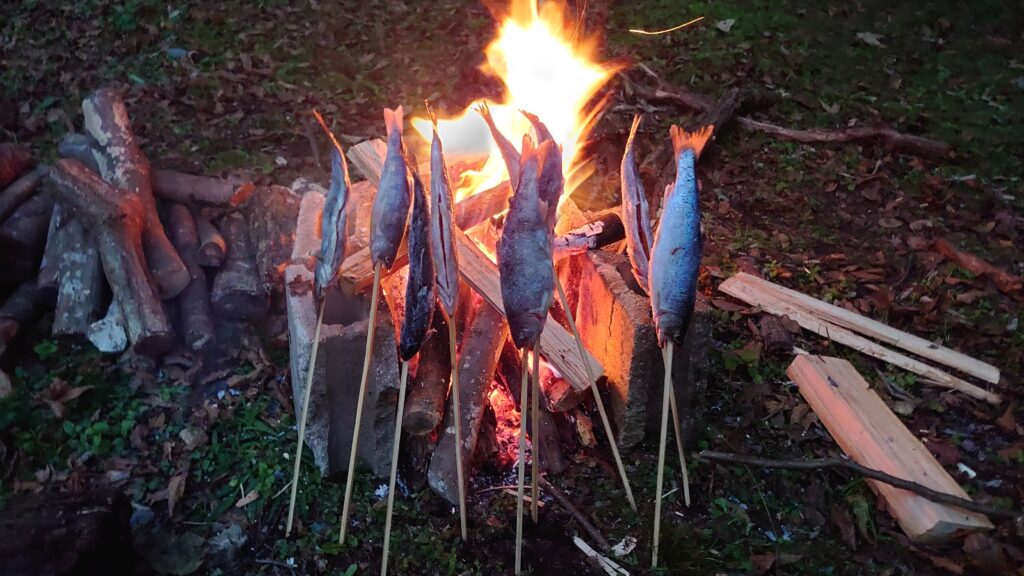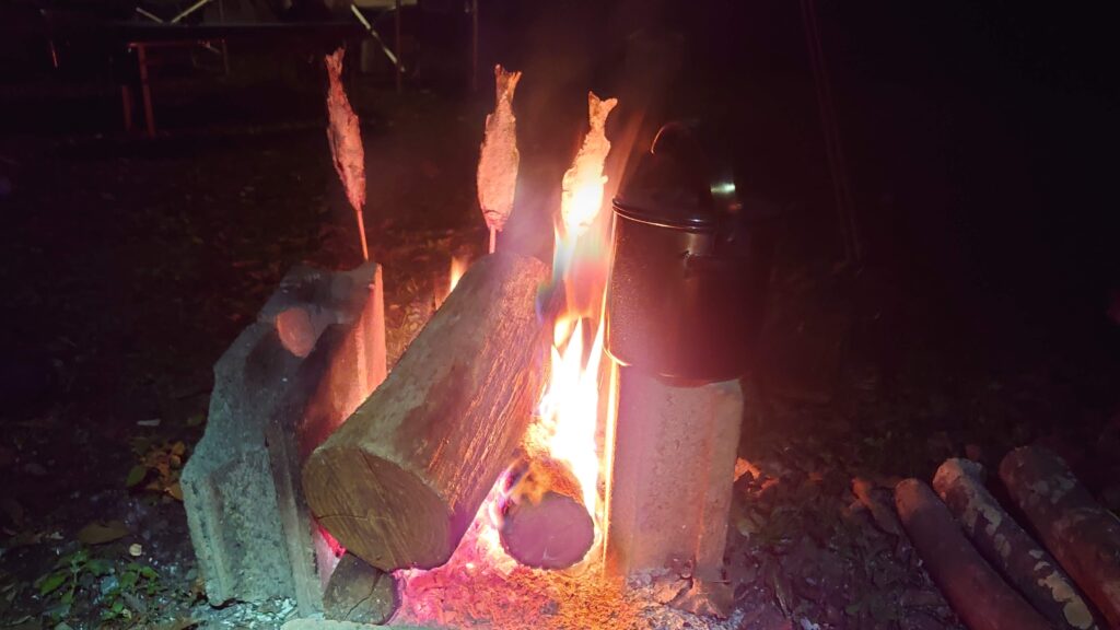 串を打って塩を振って焚き火で焼くわけですが、焼き上がるには1時間以上かかります。なので・・・