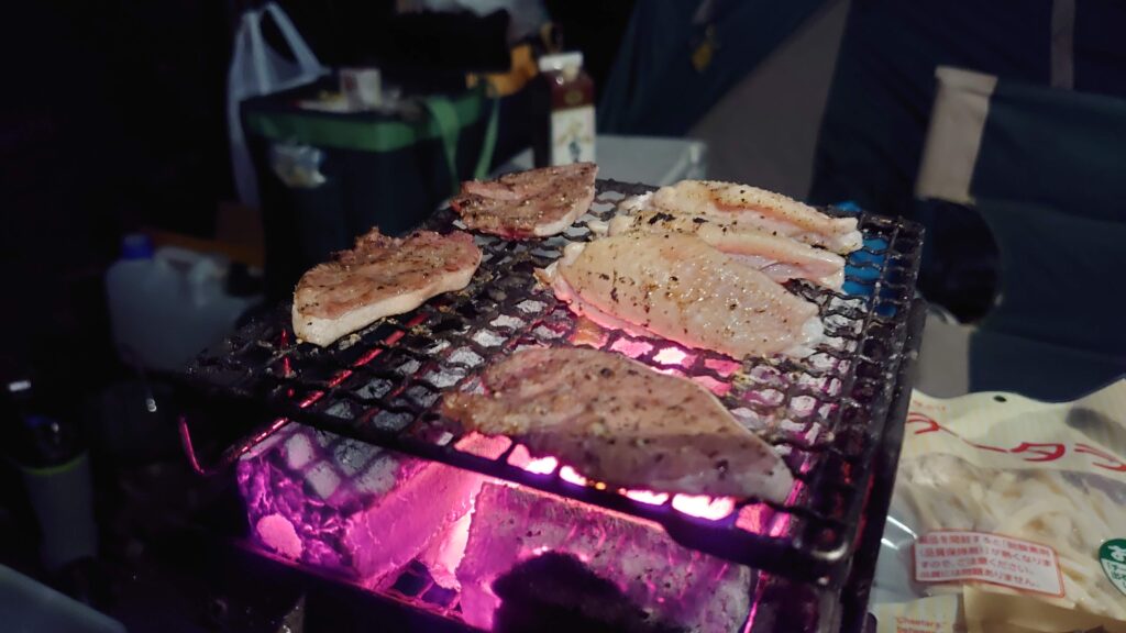 暗くなってからは気温がどんどん下がっていきます。寒いので焚き火の炎も大きくなります。防寒着が無いと外では無理ですね。焚き火で塩焼きにしたかったからがんばりましたが^^;