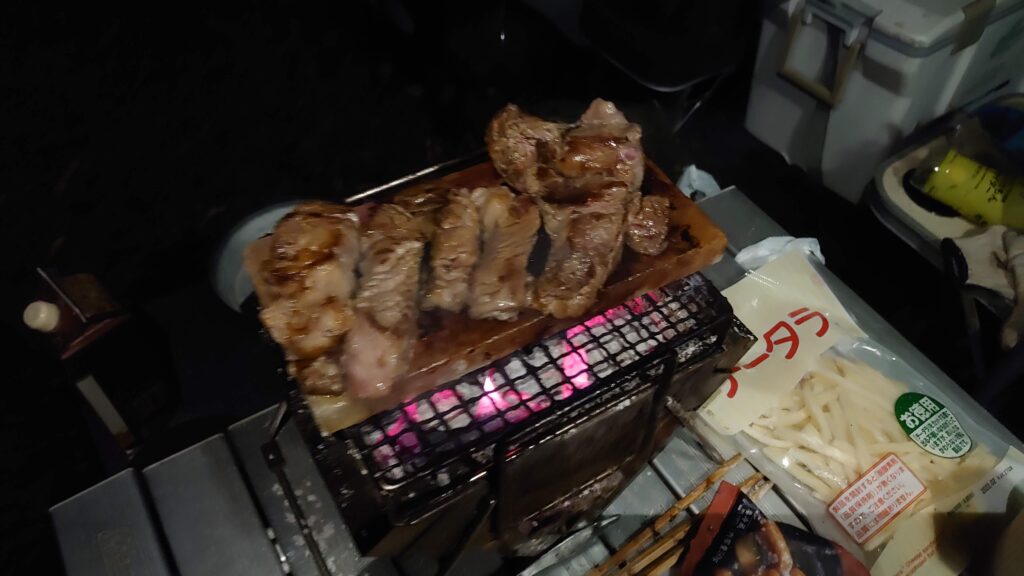 ステーキ肉を岩塩プレートで焼きます。これもいい感じです。