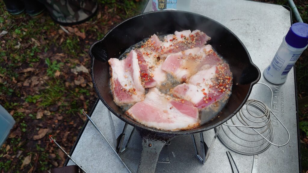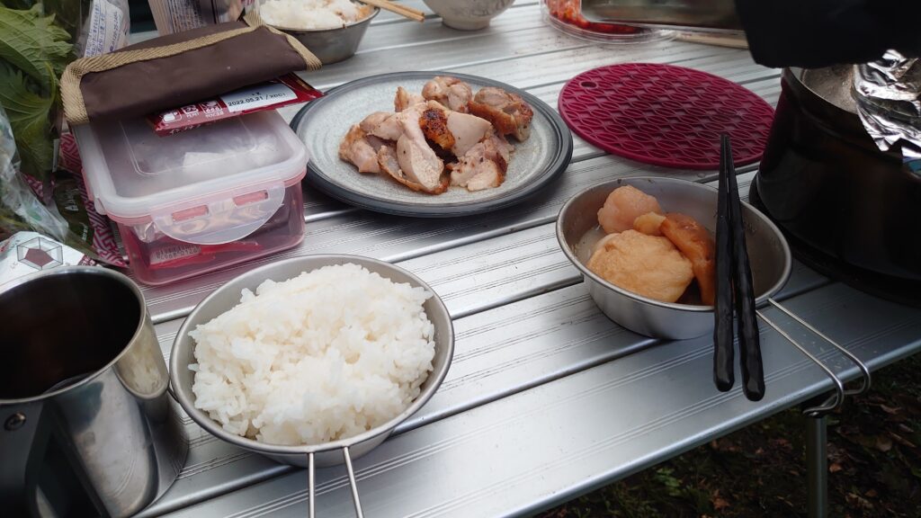 翌朝は残り物のおでんと、スキレットで焼いた肉をいただきました。このあとは撤収です。天気は下り坂でしたが降られる前に片付けが終わりました。しかし、朝露でびっしょり濡れていたので、帰ってからのメンテは必要でしたが^^;